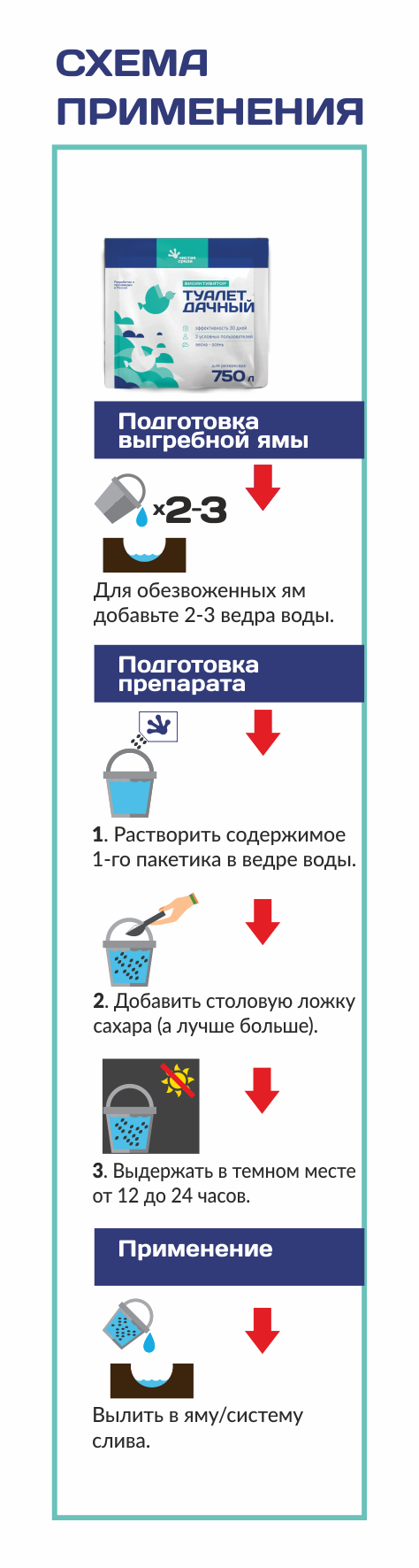 Содержимое одного пакета высыпать в ведро с водой , перемешать. Для усиленного эффекта добавить столовую ложку сахара и выдержать 12 часов. Далее залить в выгребную яму/систему слива туалета. Если содержание ямы обезвожено, предварительно добавить 2-3 ведра воды. Эффективность препарата выше во влажной среде. Повторить обработку через 30 дней либо по необходимости.